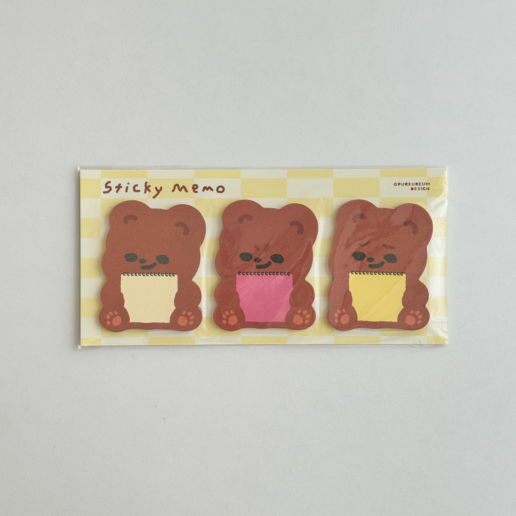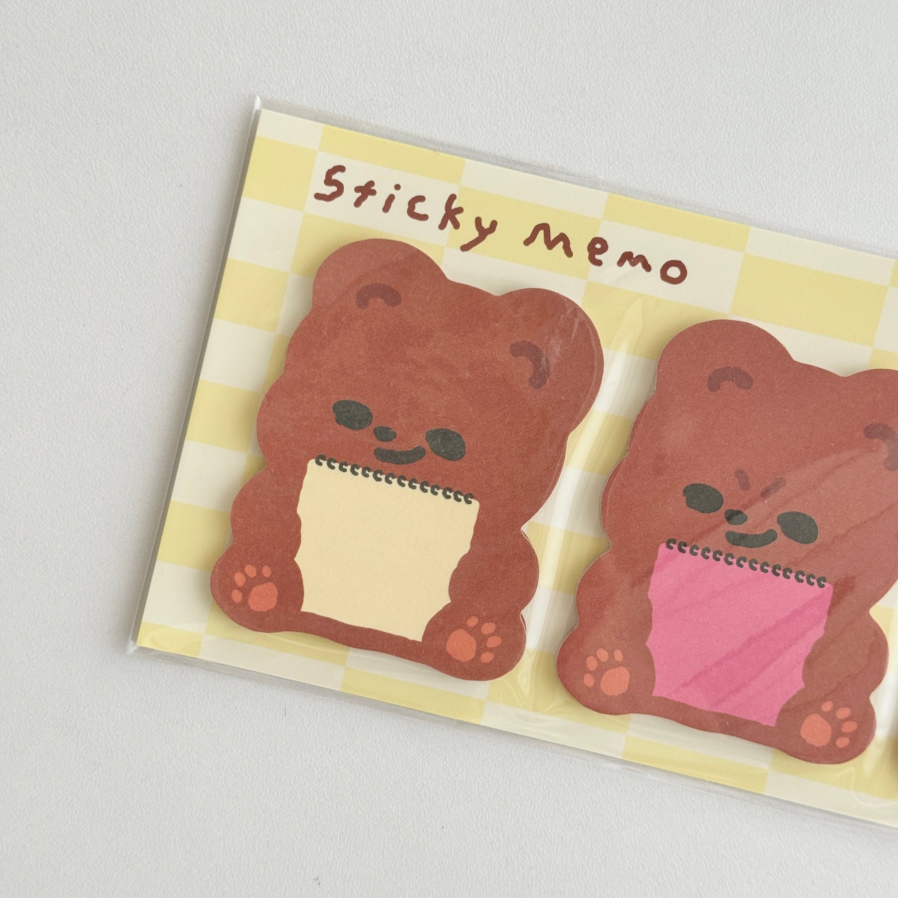 ちょこんと座ったクマの、見た瞬間にほっとする、あたたかみのあるデザインの付箋セットです。